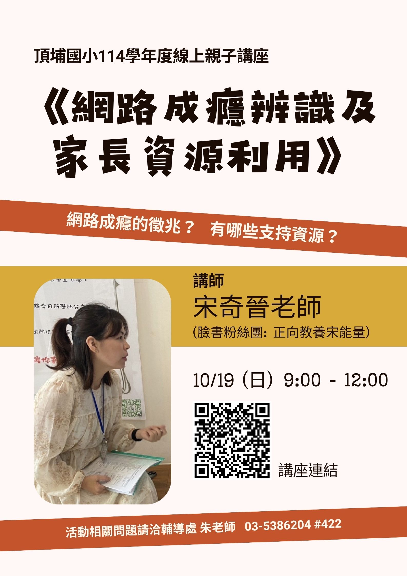 本週日10/19本校辦理《數位時代親職心角色~網路成癮辨識及家長資源運用》線上講座