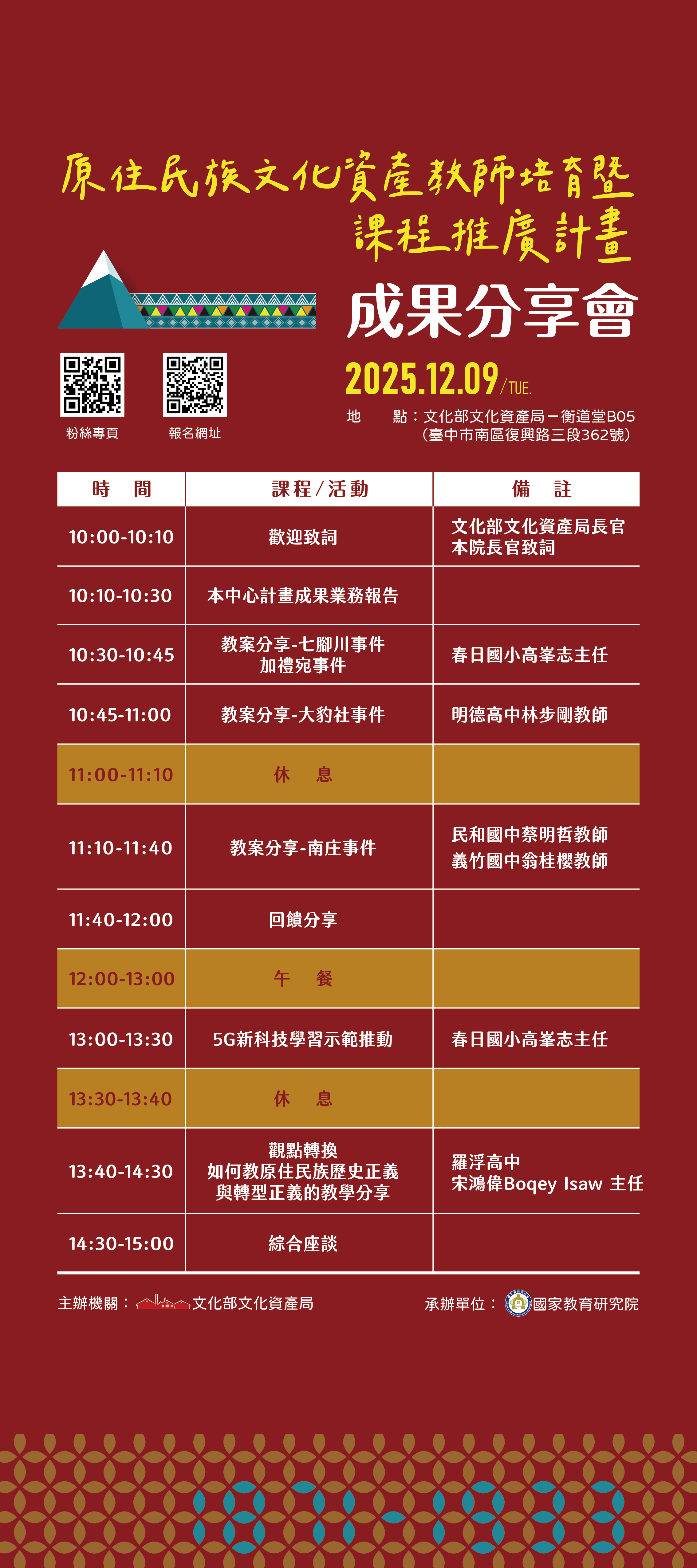 | (一) | 時間與地點︰114年12月9日(星期二)假文化部文化資產局-衡道堂B05(臺中市南區復興路三段362號)舉辦。 |