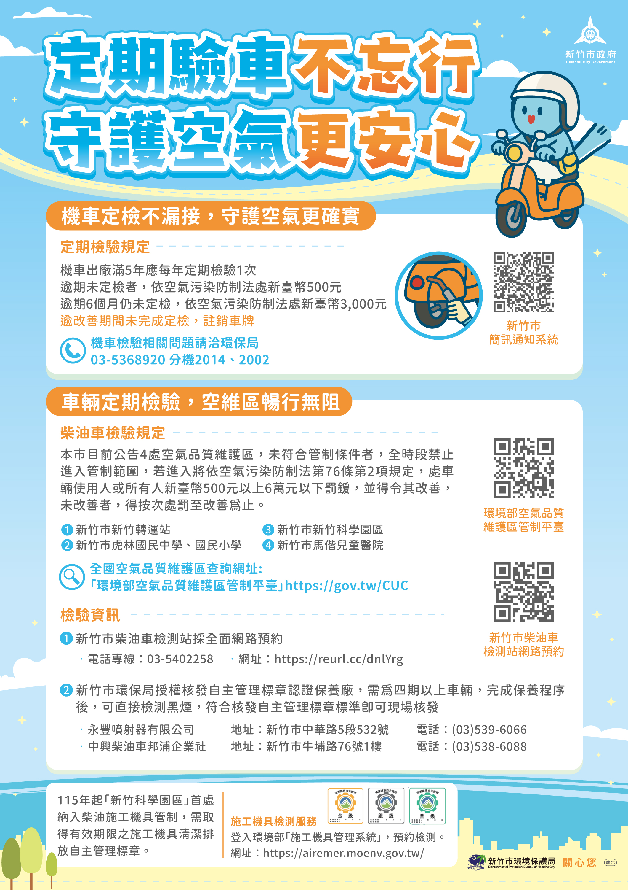 | 一、 | 機車車輛出廠滿五年應每年定期檢驗1次,逾期未定檢者,依空氣污染防制法處新臺幣500元以上1萬5,000元以下罰鍰,最重得註銷牌照。 |