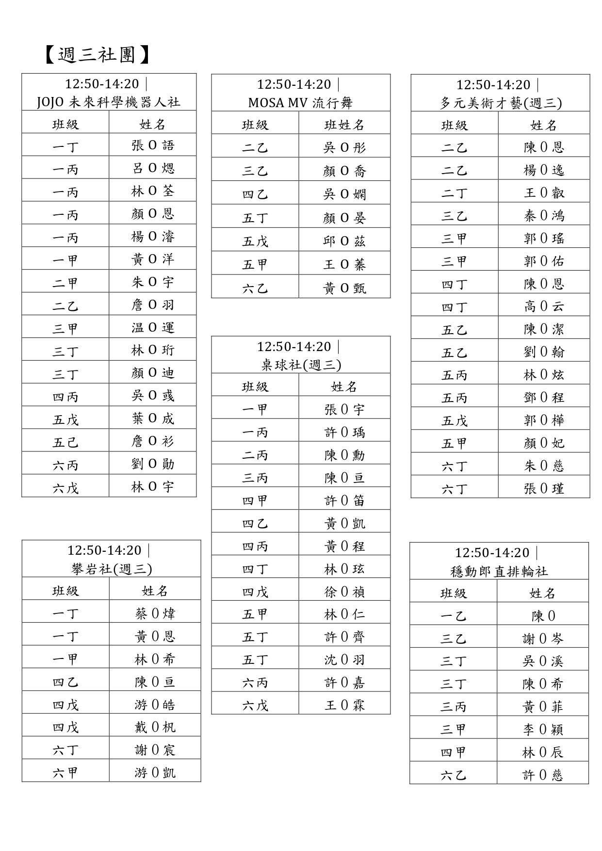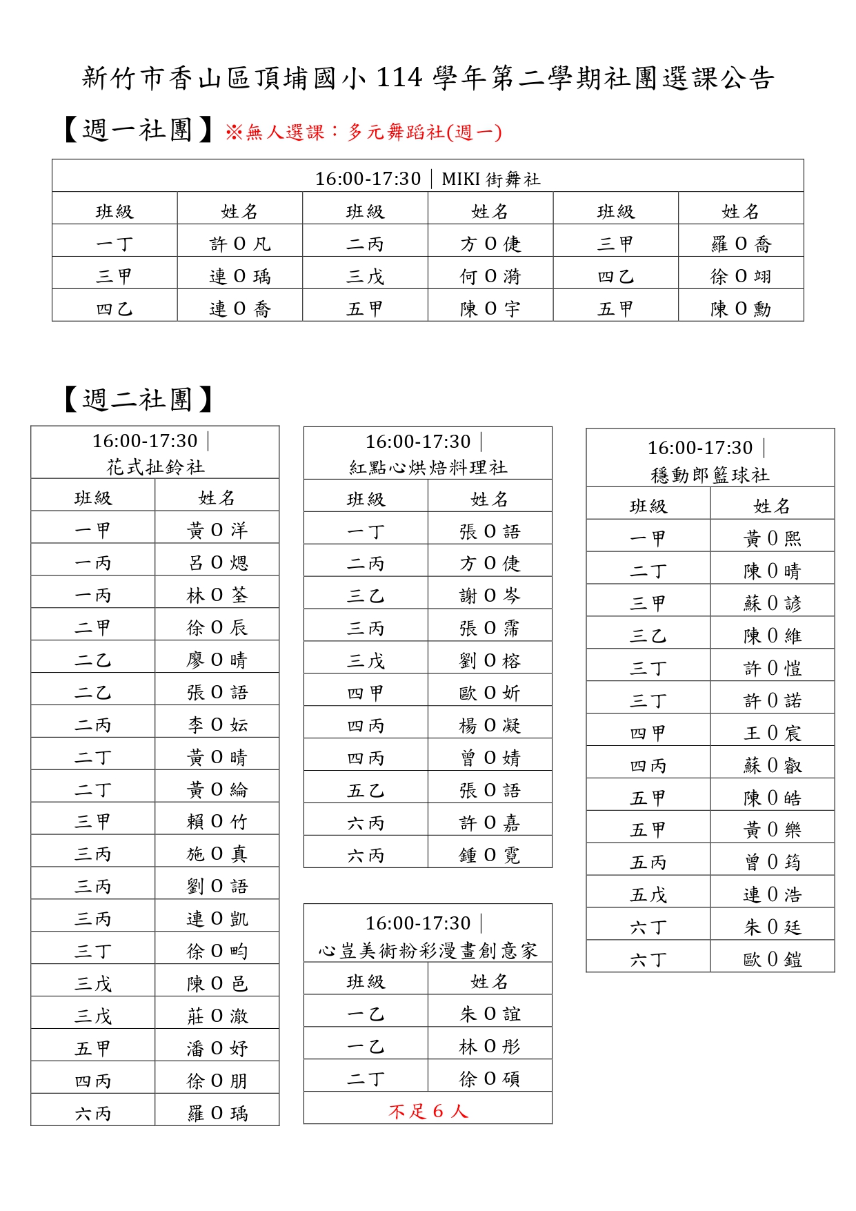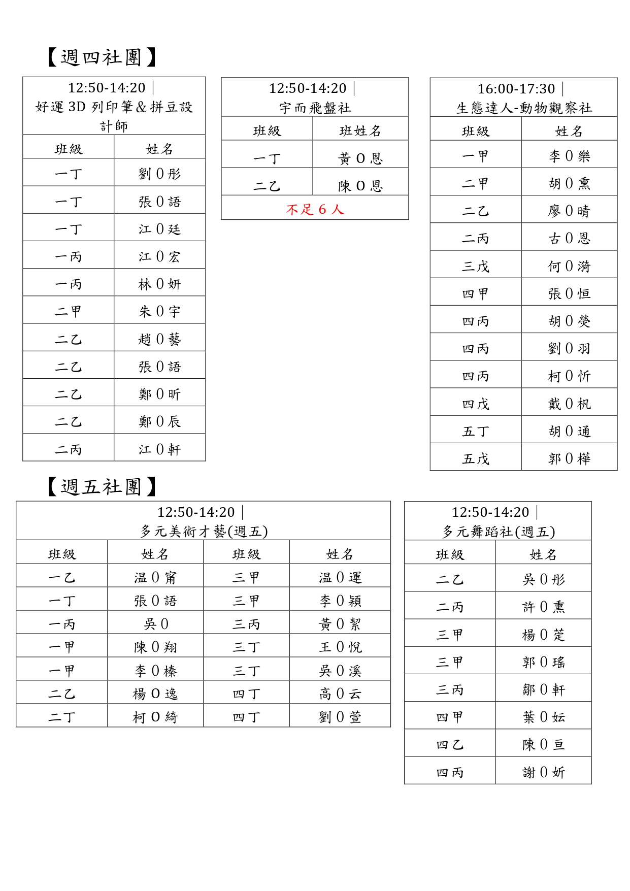 114學年第二學期-學生課後社團選課名單,名單有誤請洽學務處活動組長郭組長03-5386204#121